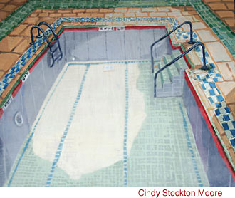 The pool is divided into thirds. Slow, medium and fast lanes. Until this summer, I have always preferred the slow lane. In addition to feeling no pressure, I get to closely observe the colorful characters who, like me, favor that lane: elderly ladies doing Esther Williams-style morning exercises in flowered bathing caps; a few younger people who push themselves along with their feet, pretending to swim (the pool is three feet deep all the way across); and, one morning, a woman with a swim mask searching the bottom for change. In the middle lane, decent swimmers do their laps, while the fast lane is a constant uproar of sleek bodies slicing through the water at a breakneck pace. I did, one time, venture into the fast lane because there seemed to be more room there, but I was in fear of being swum over and quickly retreated back to the slow lane where I could relax and still feel like I was moving fast.